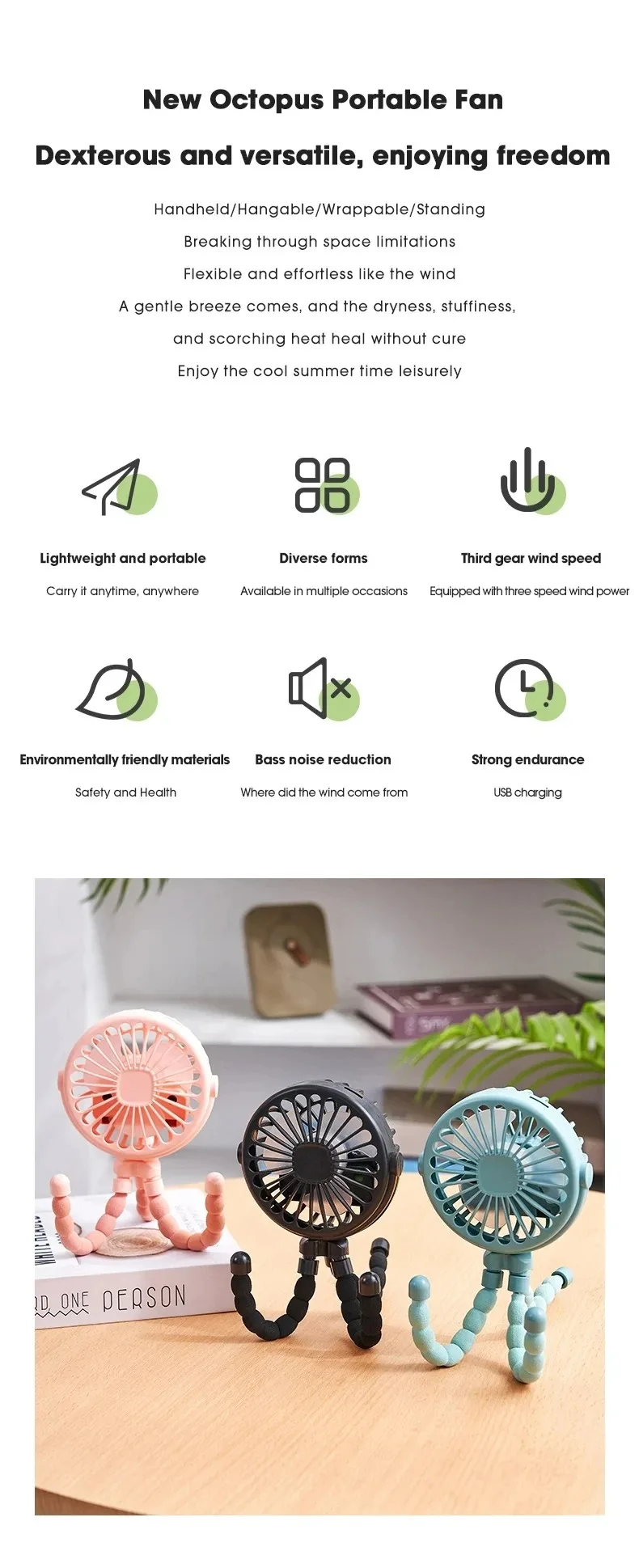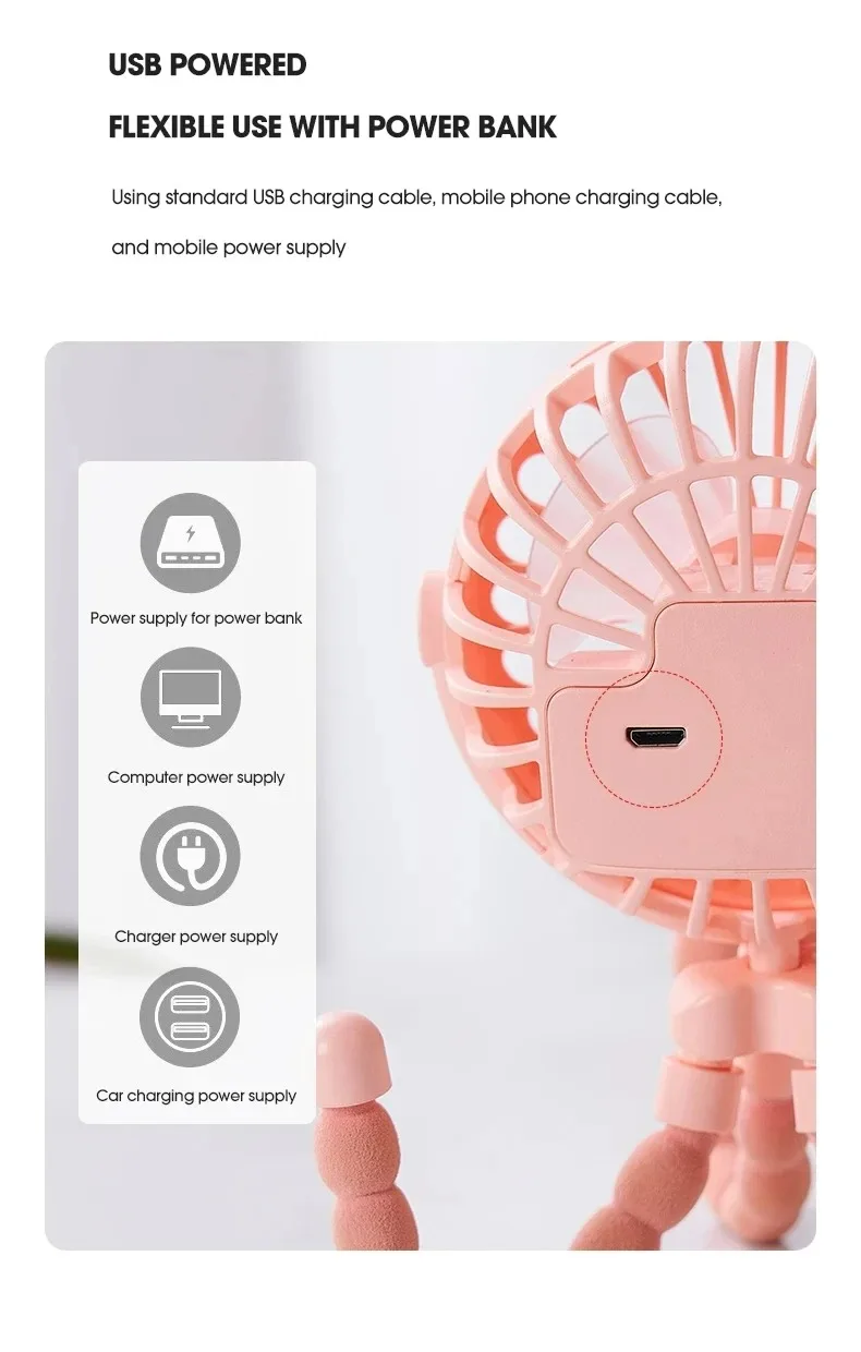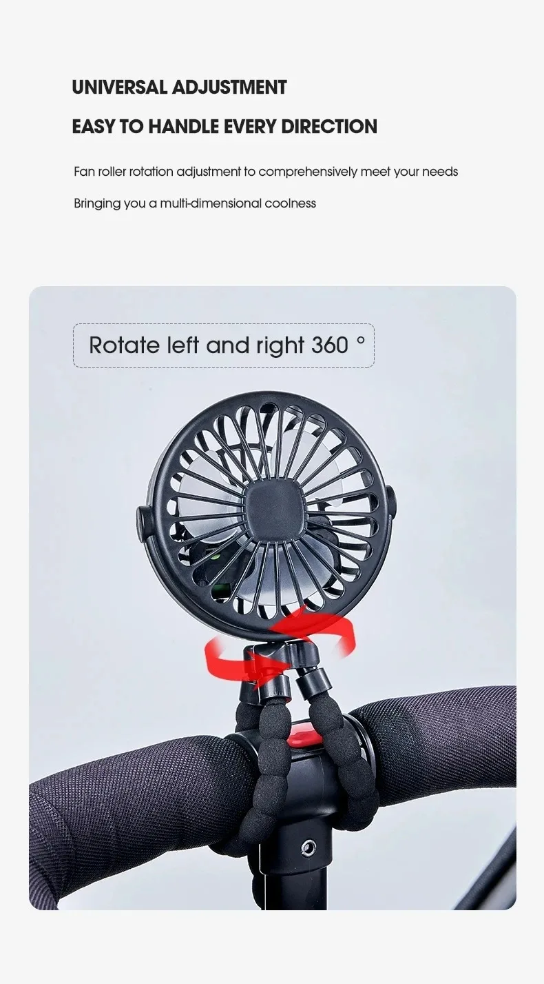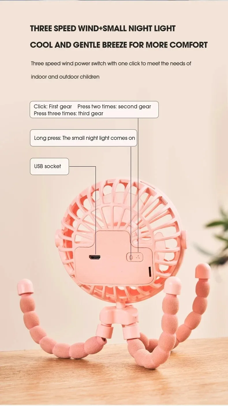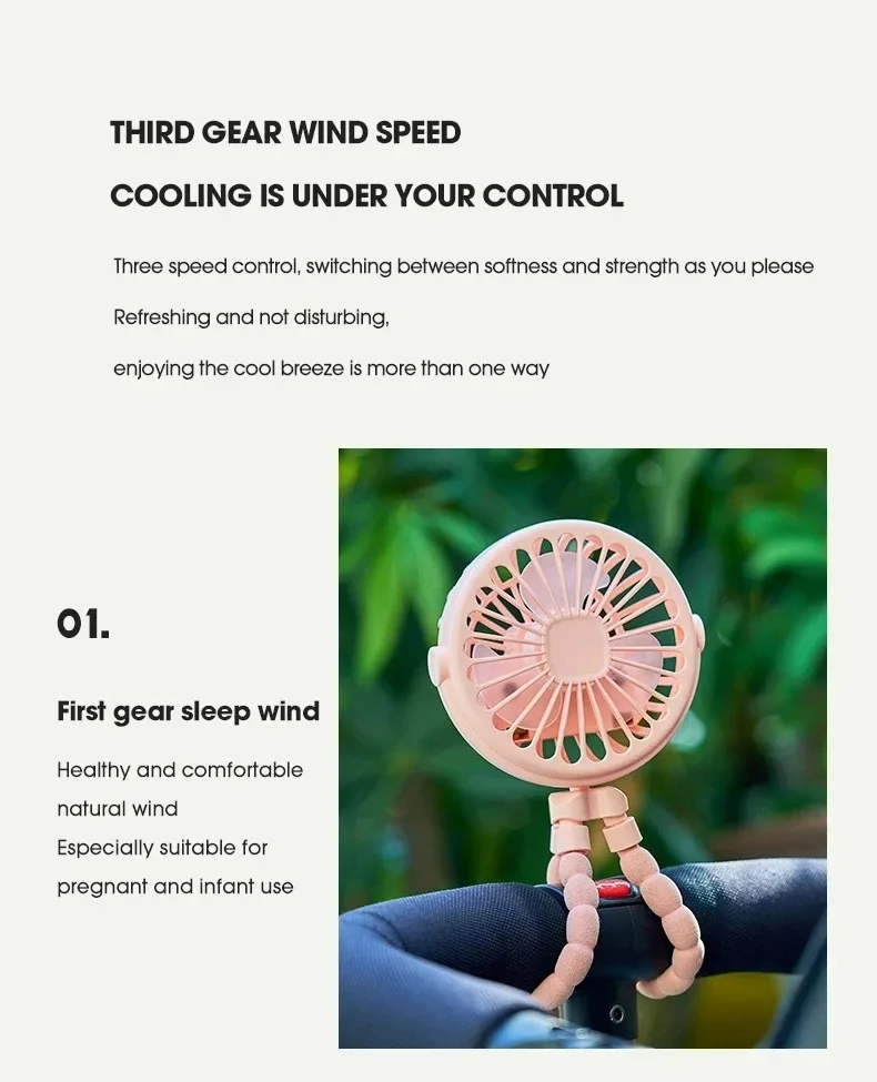 The portable outdoor fan is a USB rechargeable, clip-on baby fan designed for versatility and convenience. It features three speed settings and a 600mAh battery, making it an ideal cooling appliance for home use or while out with a stroller. Perfect for keeping your little one comfortable, this mini fan combines practicality with ease of use.