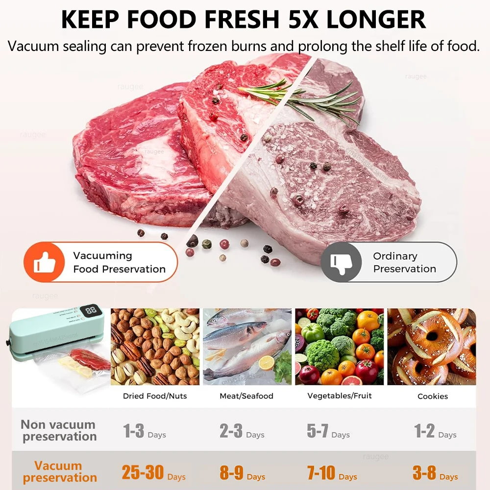 【Powerful Suction & Digital Display】 Our raugee mini vacuum sealers for food storage equipped with a robust 60kPa suction pump, this meat vacuum sealer efficiently completes sealing in 10-20 seconds, providing superior vacuum levels; Intuitive digital controls with LED display allow easy selection of desired mode and sealing time.