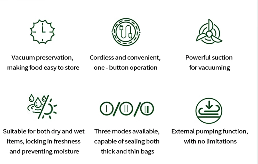 【3 Modes for Daily Use】 "Vacuum Seal" mode: one-touch automatic vacuum and seal, suitable for food that is not easily deformed, such as meat, nuts, and vegetables; "Single Seal" mode: only seal, for chip bags or pet food bags; "Click to Draw" mode:control the vacuuming process by yourself then seal it, suitable for soft food or moist food.
